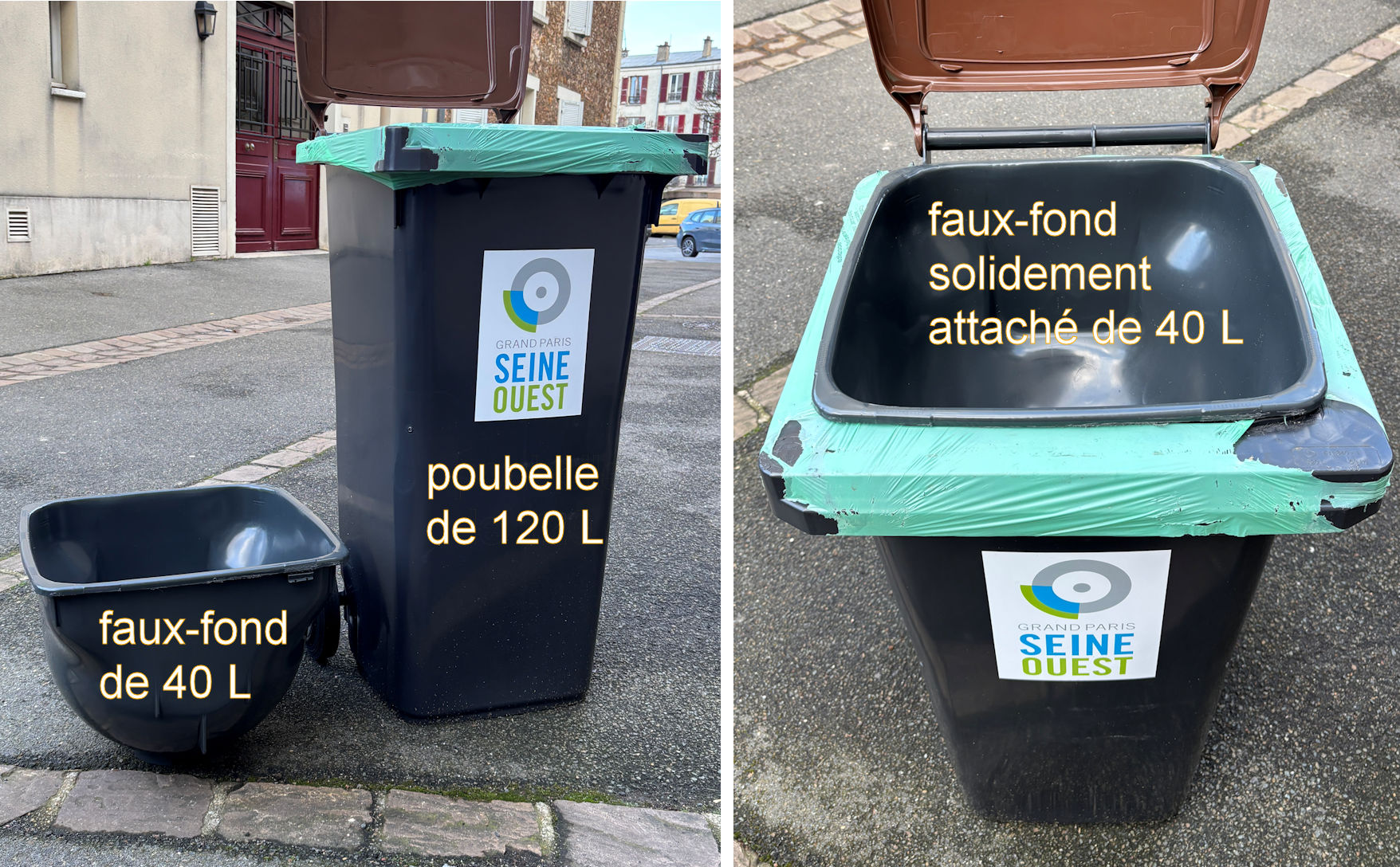 J’habite une maison de ville à Meudon dont la gestion des déchets est de la responsabilité de Grand Paris Seine Ouest (GPSO). Depuis peu, pour le bien-être de la planète, les déchets alimentaires compostables doivent être mis à part dans une bac spécial marron de 120 litres que j’ai reçu. Je me suis empressé de l’ouvrir et à ma grande surprise, j’ai constaté qu’un faux fond de 40 litres avait été rajouté réduisant la capacité de deux tiers. J’ai donc scié laborieusement les dix agrafes qui maintenaient très solidement la cuvette réductrice.